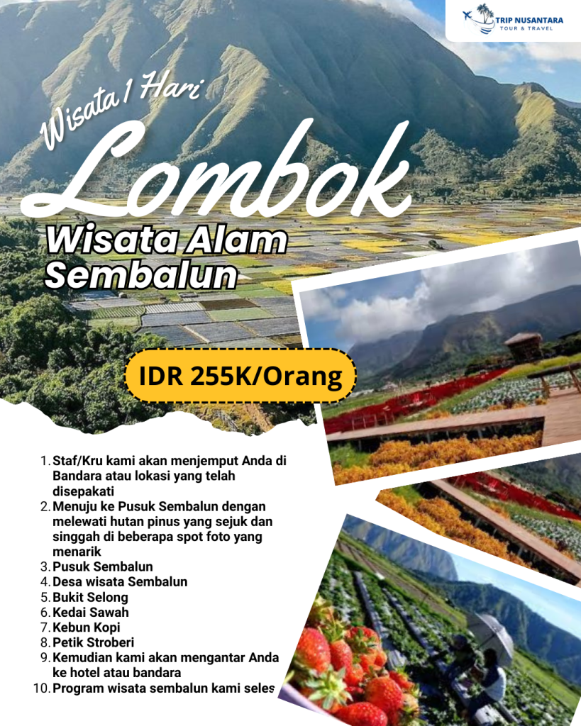 Tour Harian Lombok ini di kemas untuk anda yang ingin menikmati keindahan alam Lombok dengan durasi singakat atau anda yang tidak ingin terikat dengan paket wisata lombok dengan durasi berhari-hari. Jangan ragu lagi, Anda sudah berada di situs yang tepat. segera agendakan liburan impian Anda di Lombok bersama kami dan nikmati wisata satu hari dengan berbagai pilihan lokasi menarik yang menanti Anda!!